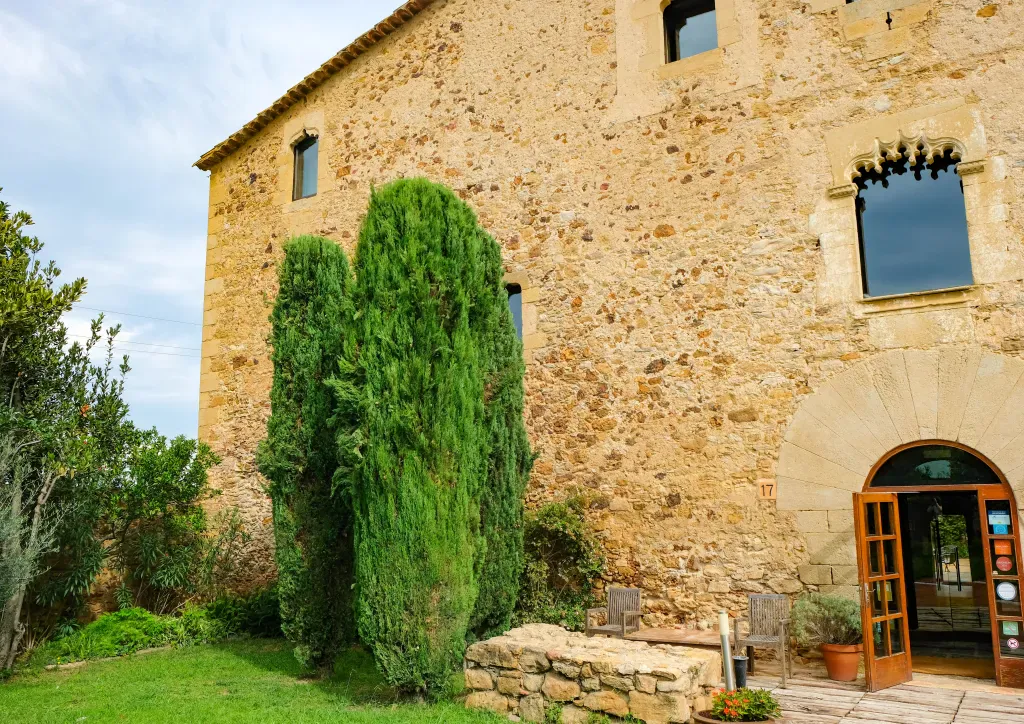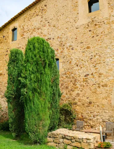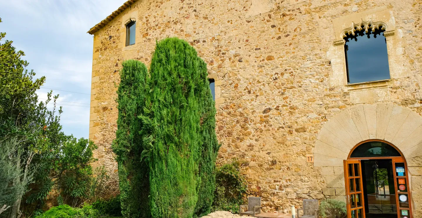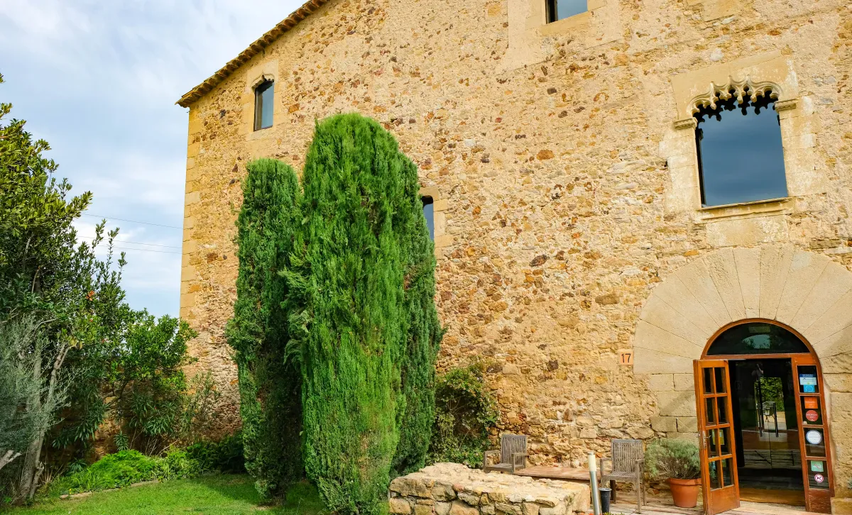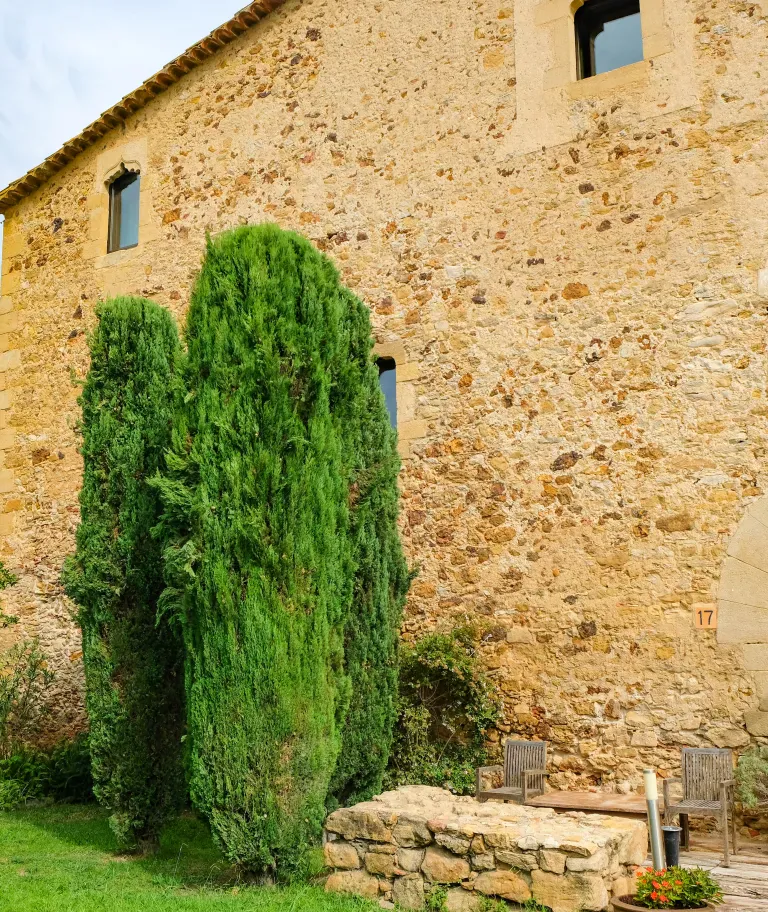 En la entrada llaman la atención tres cipreses. No es casualidad: antiguamente, muchas masías utilizaban este símbolo para indicar el tipo de acogida que podían ofrecer. Un ciprés significaba agua; dos, agua y comida; y tres, además, la posibilidad de alojarse unos días.
